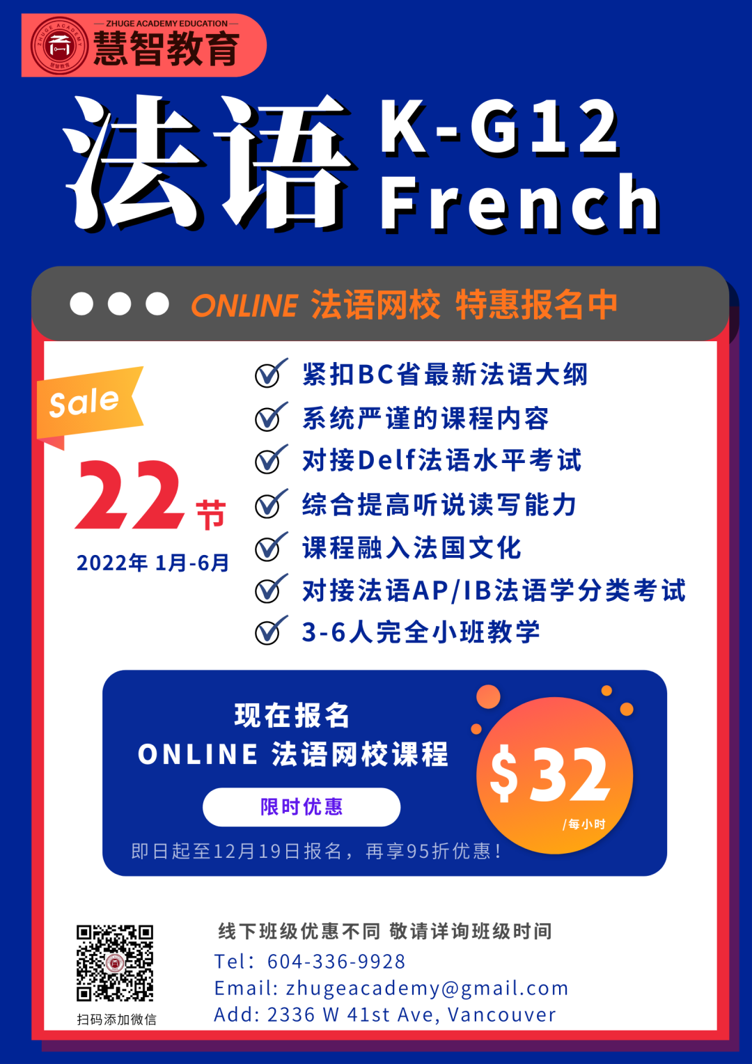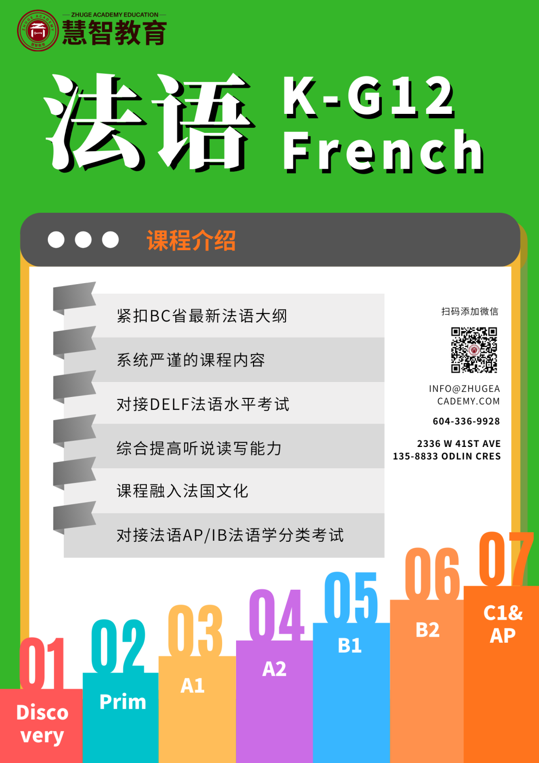 慧智法语以欧盟法语标准为框架,紧扣BC省最新法语大纲;用丰富、有趣、系统的课程内容对接DELF/DALF法语等级考试。课程旨在综合提高学员们的听说读写四项能力的同时,引导法国文化的学习,不仅可以丰富孩子们的文化内涵,也能对接AP/IB等硬核考试。如果你还对DELF/DALF考试或者法语学习有任何问题,还请咨询学霸君诸诸哟(^U^)!