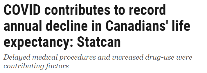 自 1921 年建立现行的死亡率衡量系统以来,“大流行对加拿大的死亡率产生了重大影响,导致预期寿命的最大年度下降”。2020 年,COVID-19 占加拿大所有死亡人数的 5.3%,仅次于癌症(26.4%)和心脏病(17.5%)。