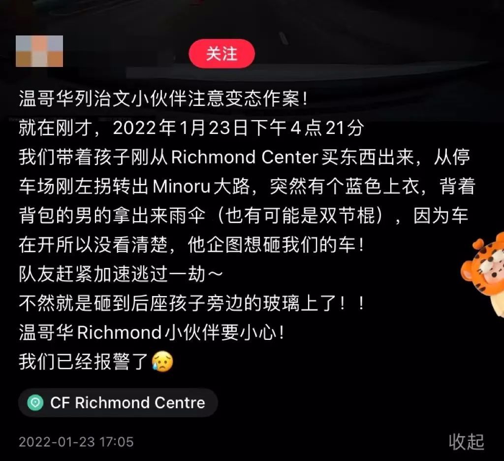 一名小红书网友发帖称,1月23日下午4点21分,他们正带着孩子从Richmond Center买东西出来,从停车场刚左拐转出Minoru大路,突然有个身穿蓝色上衣,背着背包的不明男子拿着雨伞(也可能是双截棍)冲过来就砸车。
