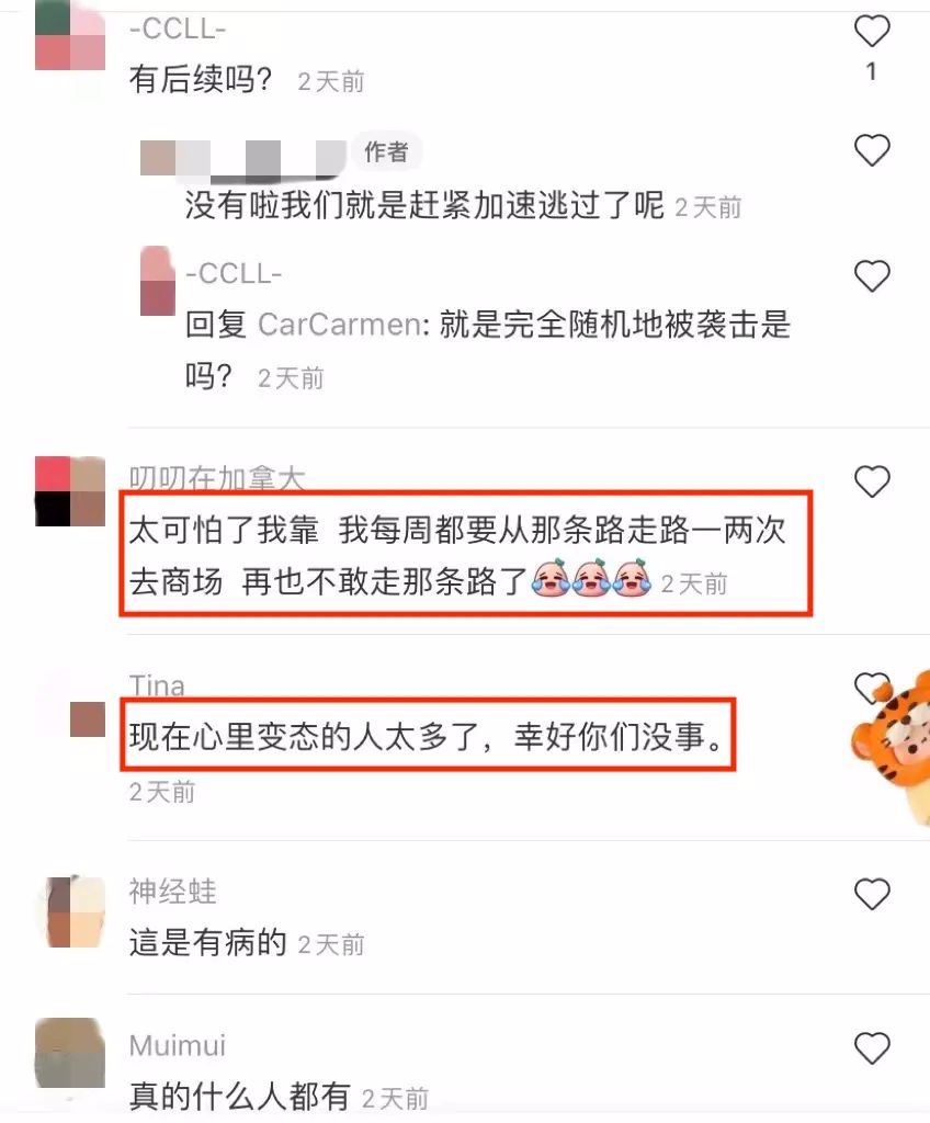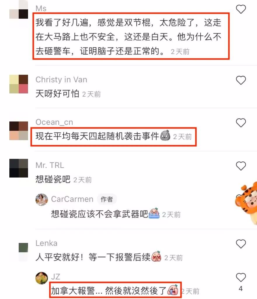 看过视频的小伙伴们评论说,“自己每周都要从那里路过,实在太可怕了”,“看了好几遍,感觉像是双截棍”,“在加拿大报警,然后就没有然后了……”。