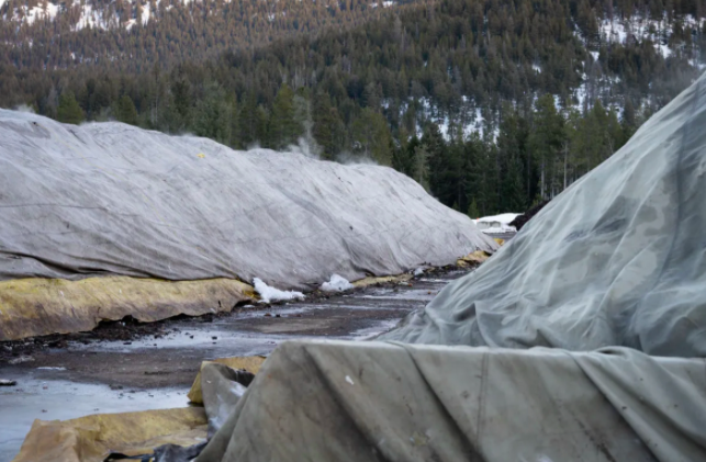 在废物处理设施(Net Zero Waste Eastgate)里,猪尸体被 Gore-Tex 防水布覆盖。(图自:Maggie MacPherson/CBC)