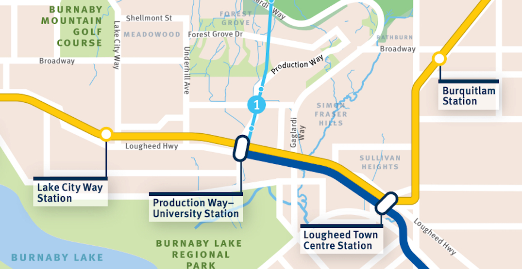 “1号线路”将 SkyTrain Production Way-University Station 和位于本拿比山顶的 Simon Fraser Campus (SFU) 核心区连成一条直线。在所考虑的三个路线选择中,它具有最快的端到端旅行时间(6 分钟)、最高的乘客潜力、最低的建设成本 2.1 亿美元、最低的年运营成本560万美元,以及最低的足迹和环境影响等优点。