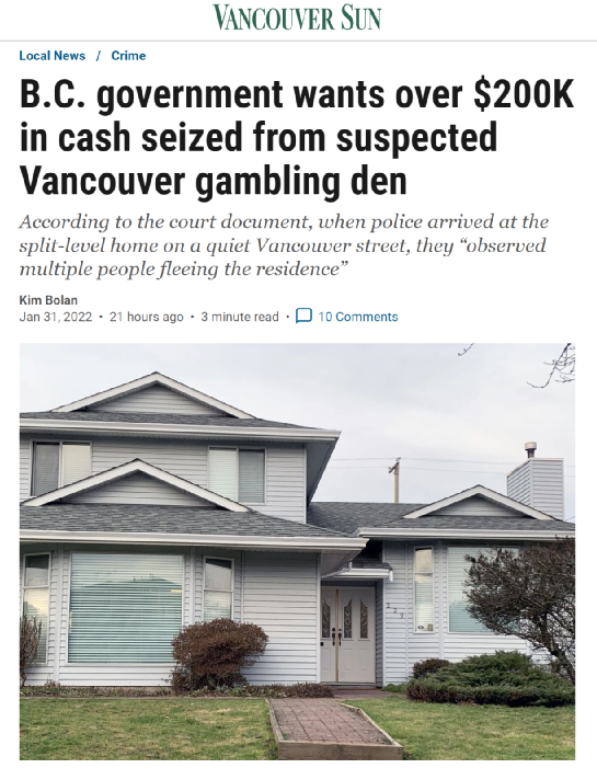 事情还得从2020年10月说起。10月12日,温哥华警察局接到举报,称在温哥华45号西街道239号(239 West 45th Ave.)的这栋房子里存在“聚众赌博以及枪支威胁”的行为。这是一家位于僻静街道的分层住宅。只是里面的人估计也收到消息,还没等警察接近,就看到从房子里面逃出来了好多人。这些人身上都携带着大量现金,少则三四百,多则七八万。