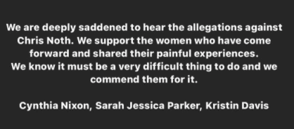 声明中称,“我们对 Chris Noth 受到的指控深感痛心。我们支持勇于公开痛苦经历的女性。我们知道这是一件非常艰难的事,她们勇气可嘉。”