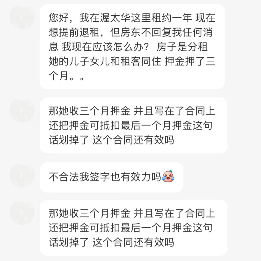 虽然租客从一开始就明确直奔主题“要毁约”,而她的关注点却聚焦到了“房东收了她3个月租金金额的押金”,并认为房东行为不合法。