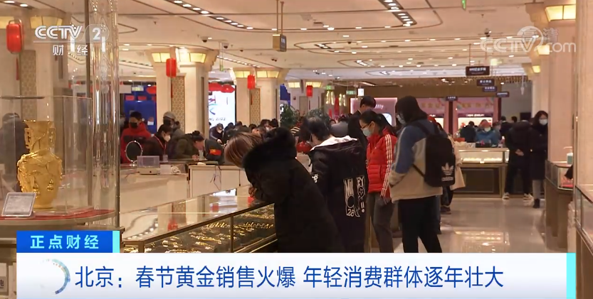 在北京一家黄金商场记者看到,虽然是早上刚开始营业,但已经聚集了不少的消费者,他们有的是为自己添置新年金饰,有的是为家人选购礼物。