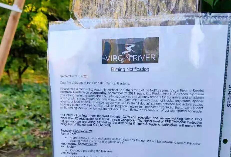 刚进大门就看见木桥边贴着一个通告,因为要拍摄电影《維琴河》的部分片段,希望居民能避开繁忙的拍摄时间段。