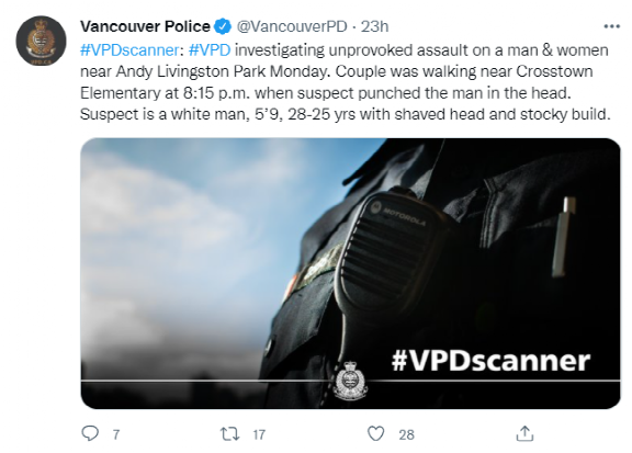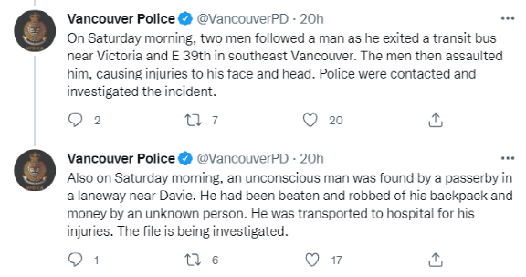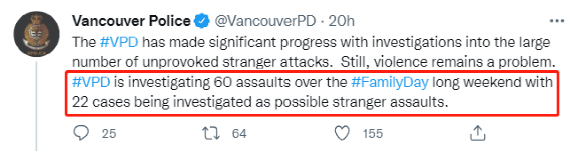 “暴力仍然是个大问题,”温哥华警察局2月22日一连发了6条推特总结了一下2月18日到2月21日发生的数起比较严重的袭击事件。