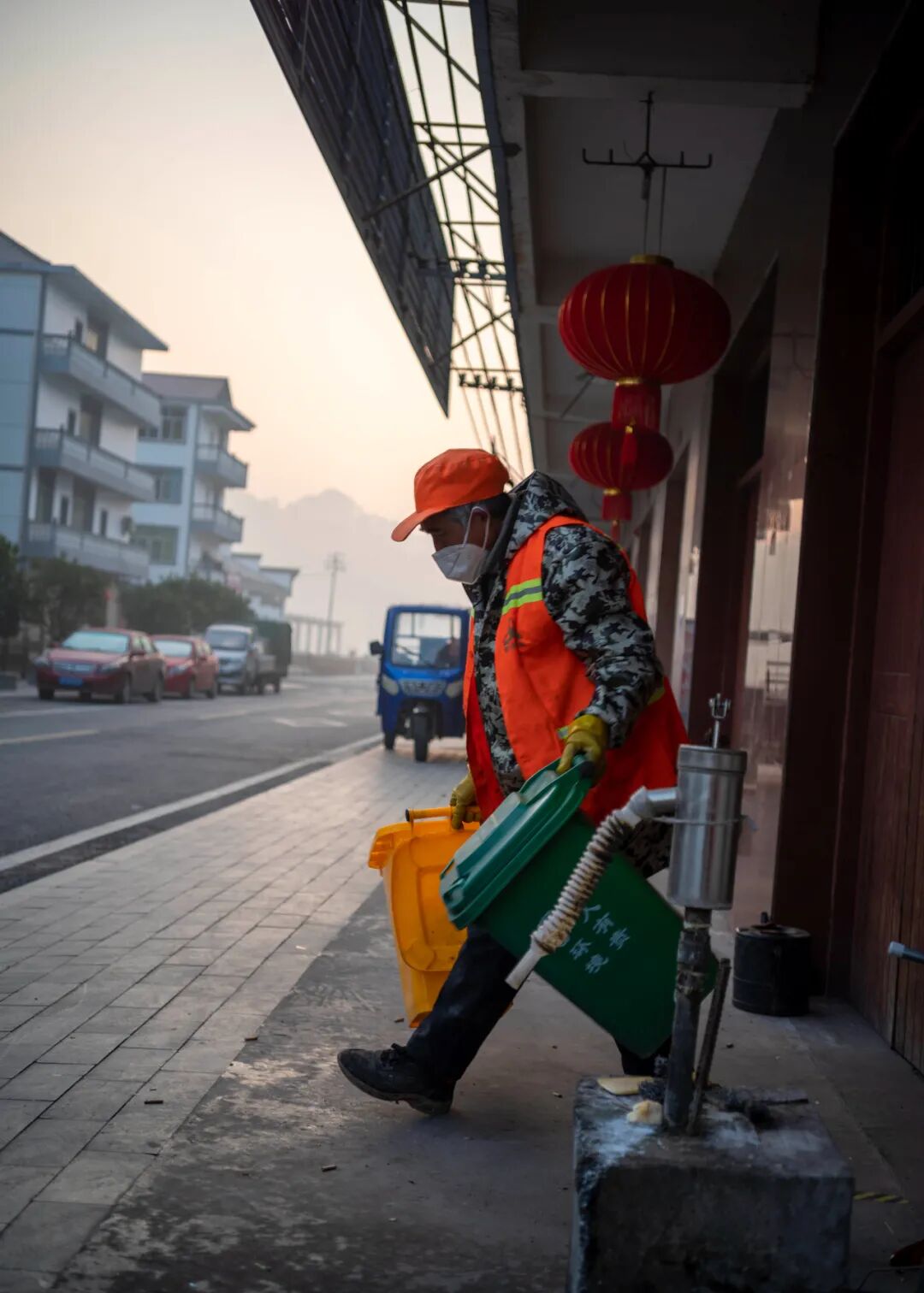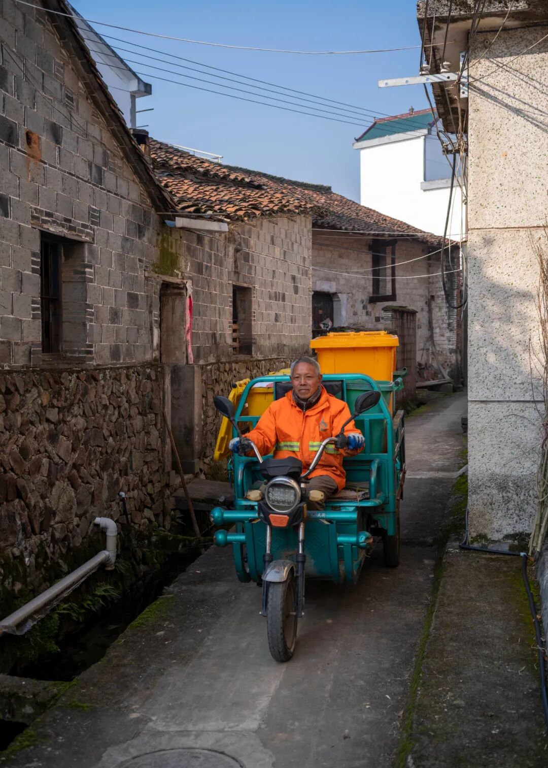 早上7点,雾还未散尽,老管已经骑着他的垃圾收运车在村里转了一个小时。冬日的早晨,这座众山环抱的村庄里,植被上结了一层厚霜。老管穿一件迷彩大衣,戴胶质手套。在一个巷口,他停好车,走了进去,不一会儿,就提着一黄一绿两个小号垃圾桶出来了。黄色桶上印着“不会烂垃圾”,绿色桶上则是“会烂垃圾”。
