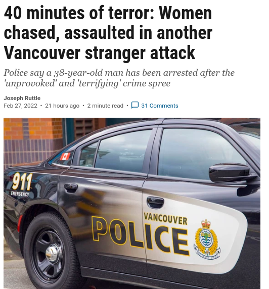 此外,在上周六中午,一名38岁男子突然在West Broadway附近砸碎温哥华医院的玻璃。“接着他又靠近一名正在开车的40岁女子,朝她做出射击的手势,还不停地敲击汽车,试图打开车门。”