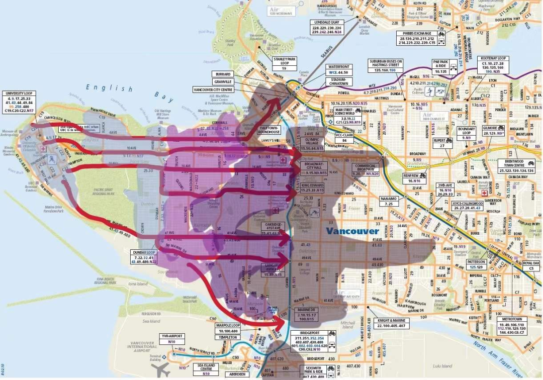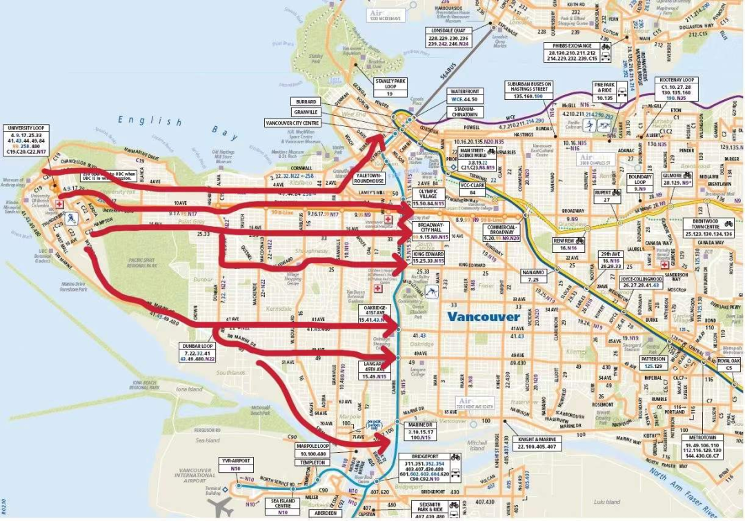 打开大温交通图,可以看到从UBC出去的公交车主要分了4条路线。每条公车路线都能连接到天车Canada Line在Cambie 街上的一个站点。