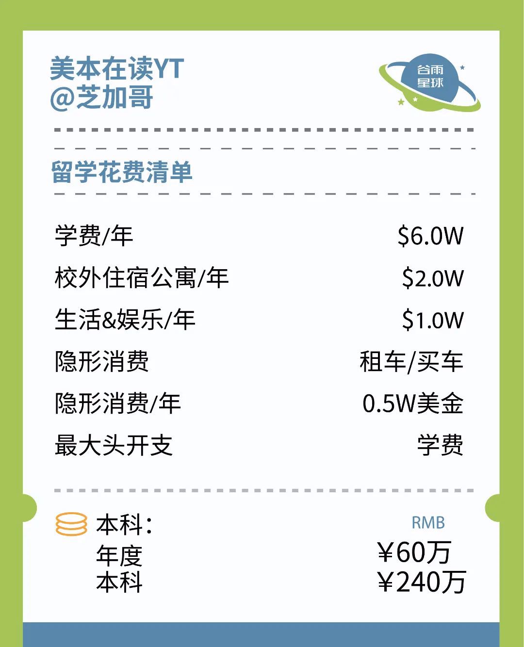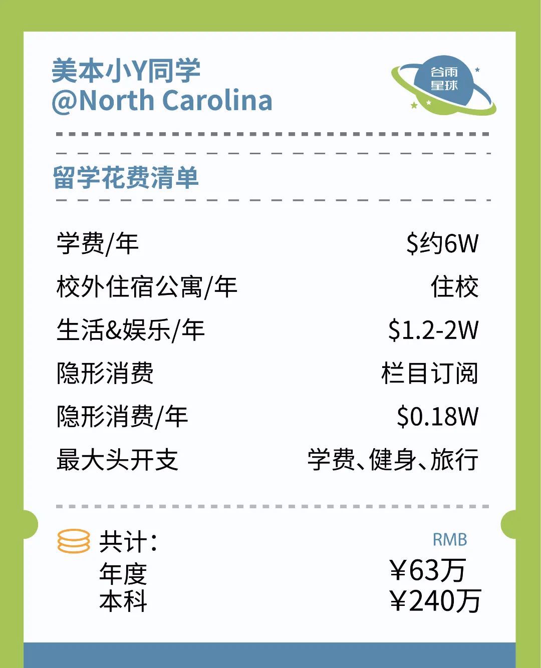 在美本读书的两位同学都跟我们说,一年花费在8-10万美金,8万美金只能算打底。