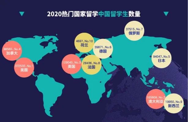 根据美国国际教育协会(IIE)(Project Atlas 2020)数据显示,除了美国、英国、加拿大和澳大利亚等英国系国家外,日本、德国、法国和荷兰等都是中国留学生人数最多的前十名国家。