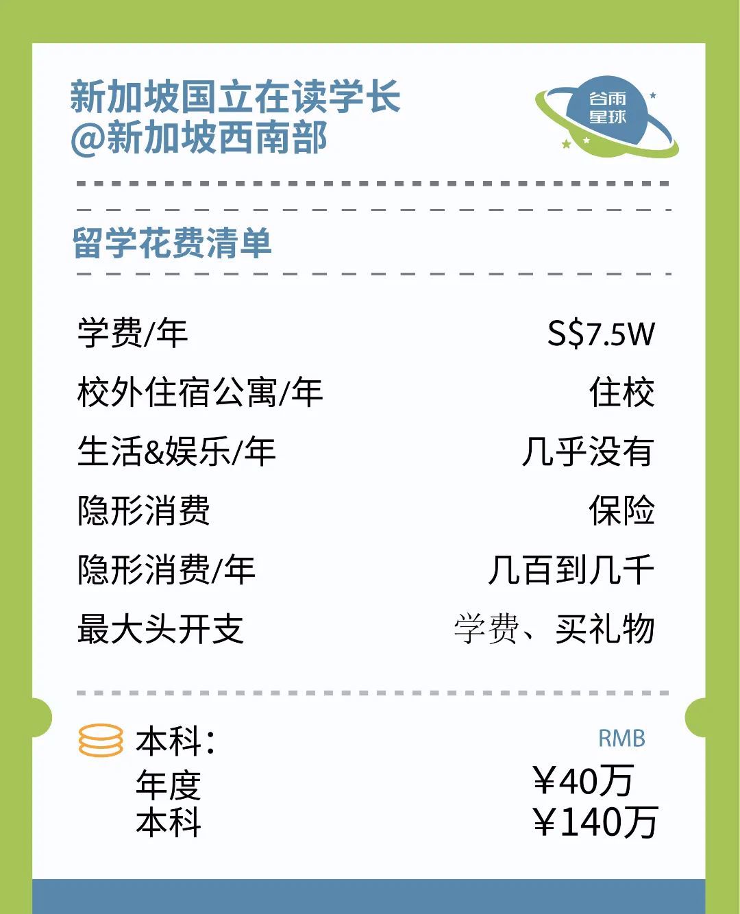 一位在新加坡国立读书的学生告诉我们,因为所读的专业学费比较贵,所以一年差不多要花掉40万。其他专业可能没有那么贵: