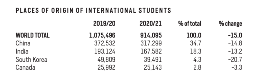 ■美国门户开放报告显示,2021/21学年中国在美留学生共计91万人,比上一个学年减少15%,但仍是第一大生源国。中国自2009/10学年起,超过印度成为第一大生源国。