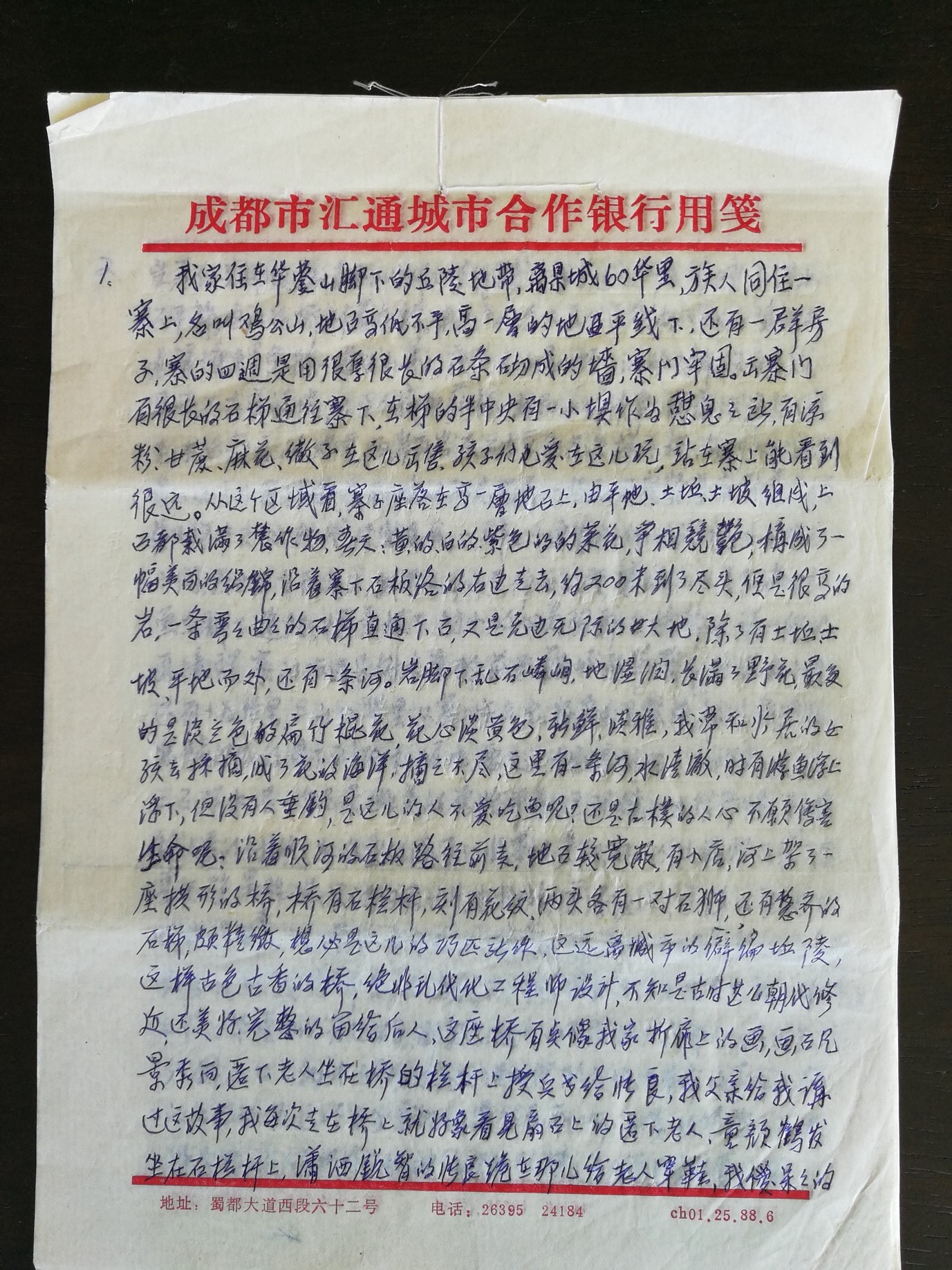 母亲在写自传时,有故乡的美丽、童年的亲情和欢乐可以追忆,有求学的经历和工作的坎坷值得回首,有勤奋多才的父亲对她的追求足可回味,还有在财经干部训练班学习革命理论时的激情让她兴奋。可是,“阶级斗争”的恐怖和她因肺结核不得不从四川省联社的病退,使她1951年之后的生活无法付诸笔端。她在自传的末尾写到,此后,她开始接受弟妹们的经济支援——因为父亲一人的工资不够母亲治病和我们一大家人的生活。