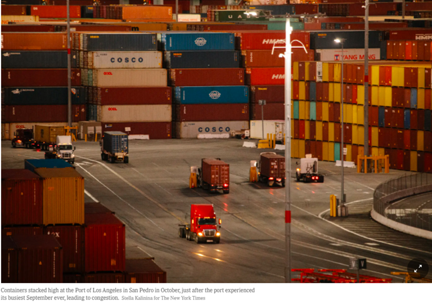洛杉矶港口的集装箱堆积如山,截图来自:《纽约时报》网页