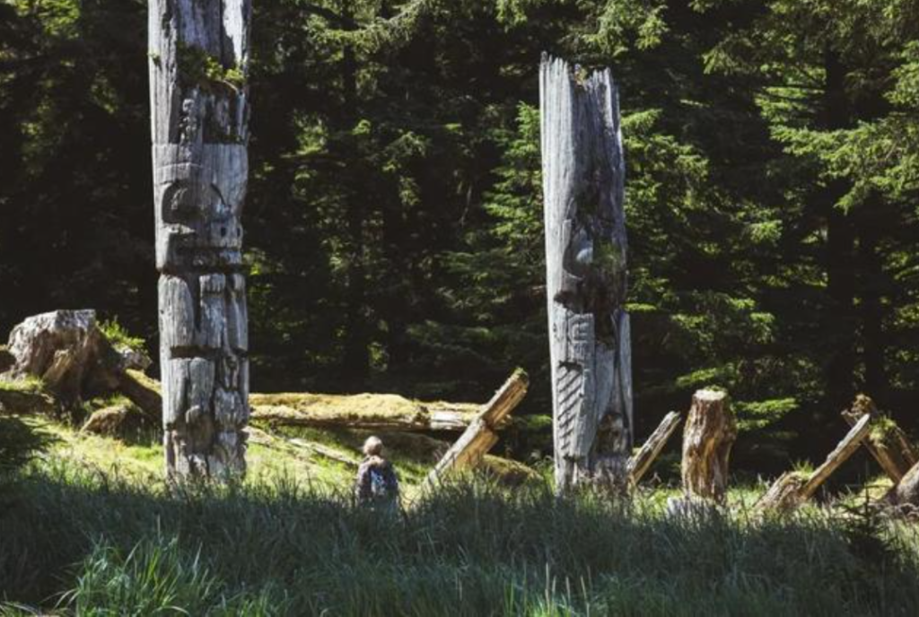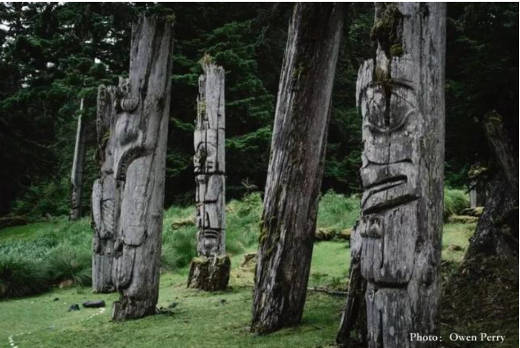 这个19世纪的海达原住民村落如今已无人居住,坍塌腐朽的长屋被半掩在红杉林茂盛的苔藓中,只有一根根记录家族历史和标识方位的图腾柱伫立着,尽管饱经磨损侵蚀,肃穆的面容依旧清晰可辨。