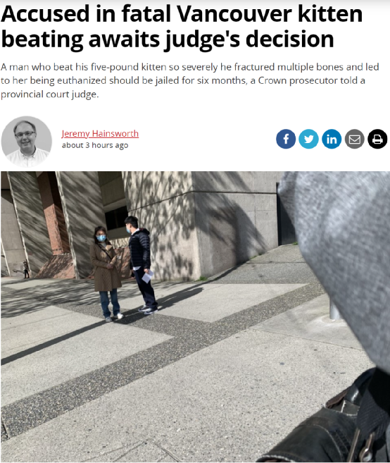 虐待动物在加拿大可算是个大事,近期,一名温哥华的华人男子就因为将自己的宠物小猫殴打致死,被告上了法庭,或将面临2年有期徒刑。