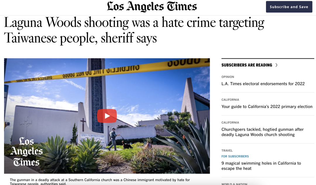 近日,美国洛杉矶一家华人教堂发生了一起持枪扫射事件,造成了1人死亡5人受伤,不少人到现在都还心有余悸。