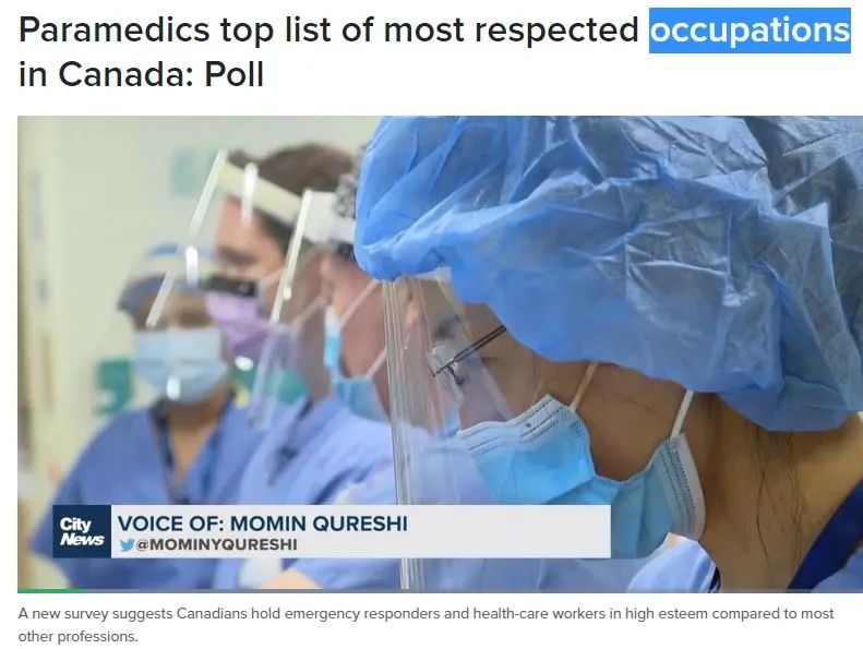 据citynews新闻报道,最近的Maru民意调查发现,在29个职业中,加拿大人将紧急救护人员列为最受尊敬的工作,而第二名是消防员。其次护士、医生和药剂师都排在前六位,而农民或农业从事者排在第四位。