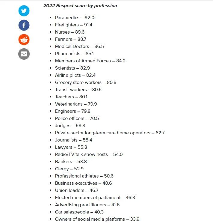 这一项职业调查提供了29个不同的职业给大家打分。受访者会根据他们的印象给出“尊重分数”,结果显示与大多数其他职业相比,加拿大人对紧急救援人员和医护人员的尊重程度最高,而社交媒体平台的拥有者却连续两年拿到最低分。