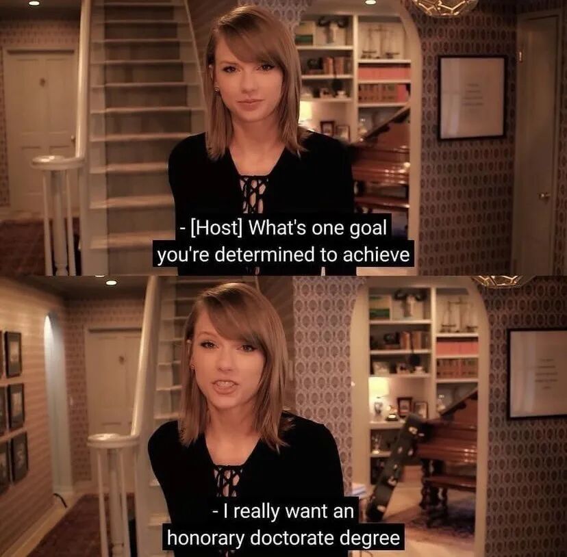 2016年,霉霉在接受《VOGUE》采访时被问及“有什么非常想要实现的目标时”表示,“我真的很想要一个荣誉博士学位”。