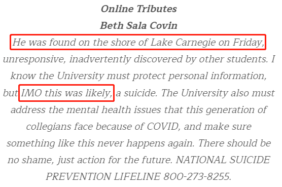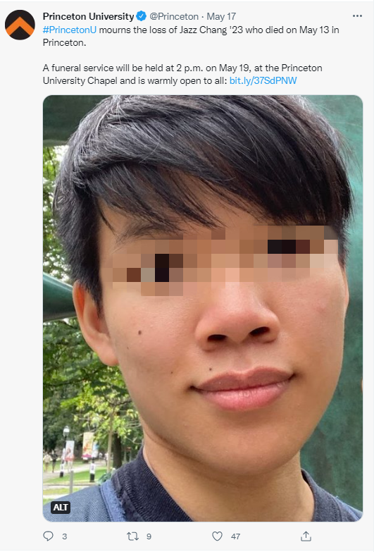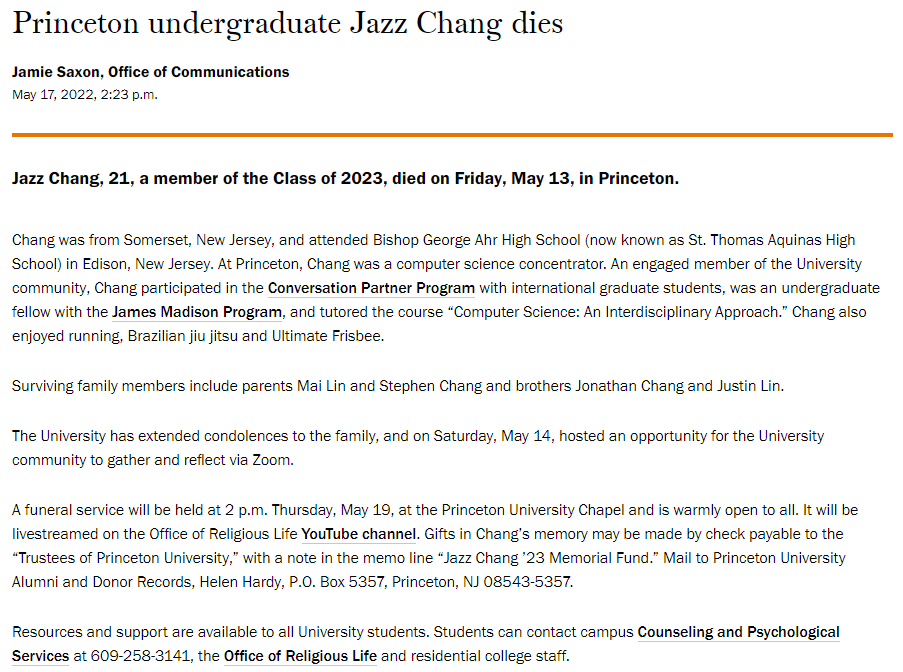 21岁华裔男生突然离奇死亡!网友透露:陈尸校园湖边!疑因抑郁自杀!2022-05-20 |作者:vancouverheadline | 来源:温哥华头条华人温哥华头条Loading...分享:#华裔学生#普林斯顿大学 痛心啊! 又一名华裔学生, 告别了这个世界! 而他的年龄永远定格在了21岁。 根据普林斯顿大学推特消息, 现年21岁的Jazz Chang, 于5月13日被发现, 殒命在普林斯顿大学内。 网友们祝愿Jazz能安息。 随后,普林斯顿大学官网 也发布了讣告, 对Jazz的去世表示哀悼。 讣告中,学校表示, Jazz来自新泽西州, 生前在普林斯顿大学, 计算机科学专业就读。 他即将于2023年毕业。 在校园中,Jazz十分积极、敬业, 他参加了国际研究生合作项目, 并辅导他人学习专业课程。 Jazz爱好广泛, 喜欢跑步、巴西柔术, 和极限飞盘运动。 Jazz在家中有两个兄弟: Jonathan Chang和Justin Lin。 以及他们的父母: Mai Lin和Stephen Chang。 在讣告中, 学校官方并没有提及 Jazz是在何处被发现, 以及死因是什么。 在一个名为DeathObits的网站上, 一名网友透露, Jazz的是在卡内基湖边, 被其他学生发现的。 当时他已经没有了意识。 这名网友认为Jazz是自杀的。 学校需要解决现在大学生们 因为新冠疫情而面临的 心理健康问题, 以防类似事件再次发生。 今天下午2点, 普林斯顿大学在校内大教堂, 为Jazz举行了葬礼, 并在YouTube同步直播, 为了那些无法到达现场的人, 一同怀念Jazz。 Jazz生前挚友 在怀念好友离去时十分悲痛, 一度泣不成声。 希望学校能调查清Jazz的死因, 让他能在天堂安息。 远在海外的广大留学生们, 日常生活中不仅要注意人身安全, 也要注意自己和周围朋友的 心理健康问题。 要及时和家人朋友交流沟通。 来源:加拿大留学生问吧 责任编辑:林伯儒 平台:温哥华头条 微信ID:Vancouverheadline 阅读 未经允许不得转载:加拿大乐活网 »21岁华裔男生突然离奇死亡!网友透露:陈尸校园湖边!疑因抑郁自杀!分享: