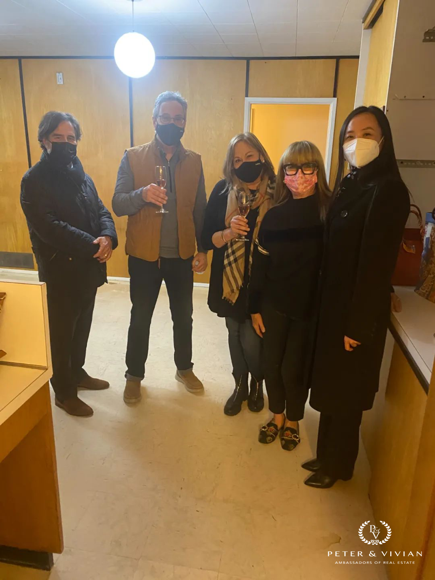 客户在接连面试了四位房产经纪之后,最终选定了 Peter 和 Vivian 的团队。当时NDP的各种针对豪宅的打压政策实行不久,2020年的豪宅市场非常低迷,很多华人买家都不敢入市;Peter 和 Vivian 主动出击、联系其他族裔的客户,多方面寻找客源;他们最终找到了一位本地犹太人买家,为这间物业找到了新的主人。买卖双方的犹太家族都非常认可 Peter 和 Vivian 的工作。交接房子当天,买家和卖家还特地带来香槟共同庆祝(下图)。他们说:“犹太人卖家、犹太人买家,其中帮助牵手成功的却是一对亚裔经纪,这在第一桑拿斯的房产交易历史上也会成为一段佳话。”