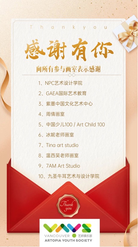 以“平等Equality”为主题的2022艺术乌托邦青少年国际绘画大赛全程得到了小画家们、家长们、老师们、各大画室、及友好人士、公益组织、企事业单位、及媒体的大力支持,值此大赛奖项揭晓之际,对支持大赛的组织和个人一并致谢!希望大家继续支持本届大赛的最后一个阶段——线上公益拍卖。部分优秀获奖作品将通过艺邦青少年俱乐部的网站(网址www.vays.ca)进行拍卖,公益善款将与大赛作品报名费一并捐往加拿大列治文医院基金会,支持加拿大列治文医院的重点筹款项目——“共谱生命三重奏计划”,支持列治文医院综合内科、心肺科和神经科更新换代诊断设备。
