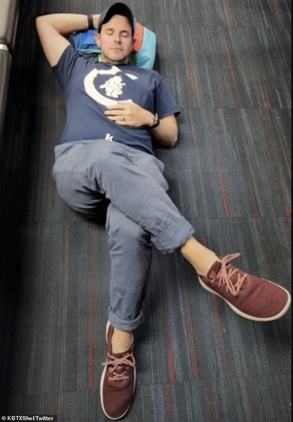 KBTX 新闻的气象学家谢尔·温克利 Shel Winkley的航班总共被取消和延误了六次——最后他不得不睡在芝加哥奥黑尔机场。