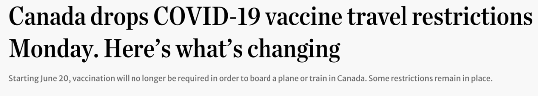 从6月20日起,无论国内还是国际旅行,加拿大居民将不再需要完全接种新冠疫苗,即可乘坐飞机和火车。