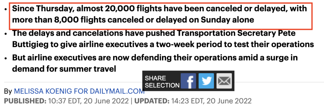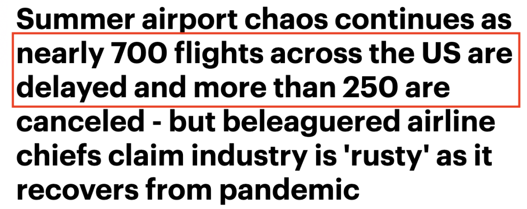 在美国,自上周四以来,已有近 20,000 个航班被取消或延误,上周日有 8,000 多个航班被取消或延误。仅在今天早上(6月20日),就有超过 750 架进出美国的航班延误,超过 250 架航班被取消。