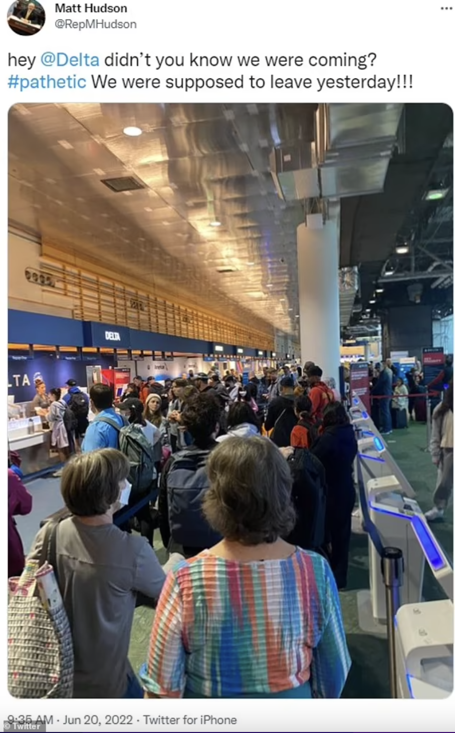 而佛罗里达州的前国会议员 Matt Hudson 也在值机时上传了一张大排长队的照片,@Delta 航空说:我们本应该昨天就离开的!!!