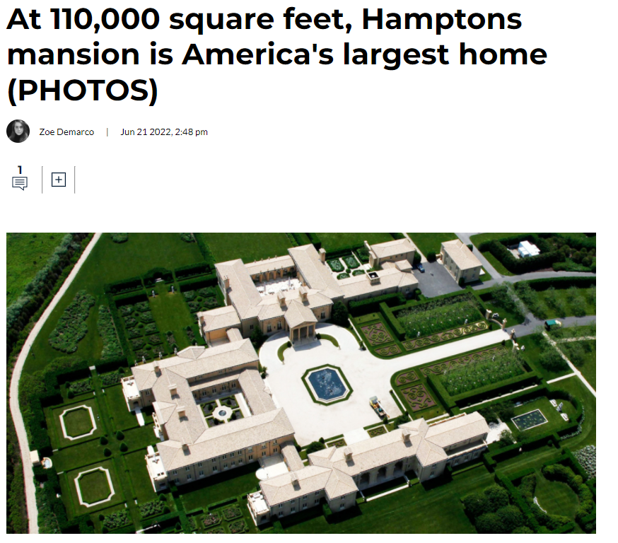 它位于纽约东部的小镇Sagaponack,房屋面积是令人咋舌的11万平方英尺!这是什么概念?相当于普通“标准5000平方英尺”豪宅的22倍,比美国白宫还大2倍!