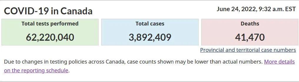 但是最新的可用联邦数据已经过时了一段时间,例如,查看聮邦公共卫生署的数据,截至6月24日上午,全加拿大共有3892409人确诊(累计),因COVID-19而死亡的人数为41470人,但底下也附注,因为检测政府改变,这份感染人数可能是低估了。