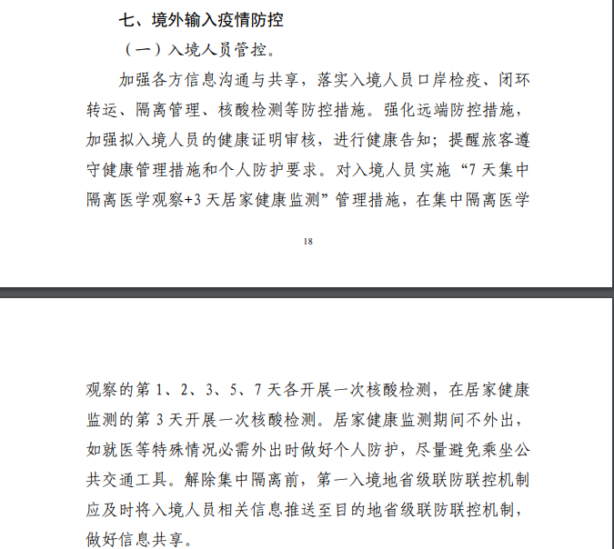 将密切接触者、入境人员隔离管控时间从“14天集中隔离医学观察+7天居家健康监测”调整为“7天集中隔离医学观察+3天居家健康监测”,核酸检测措施从“集中隔离医学观察第1、4、7、14天核酸检测,采集鼻咽拭子,解除隔离前双采双检”调整为“集中隔离医学观察第1、2、3、5、7天和居家健康监测第3天核酸检测,采集口咽拭子”,解除集中隔离医学观察前不要求双采双检。