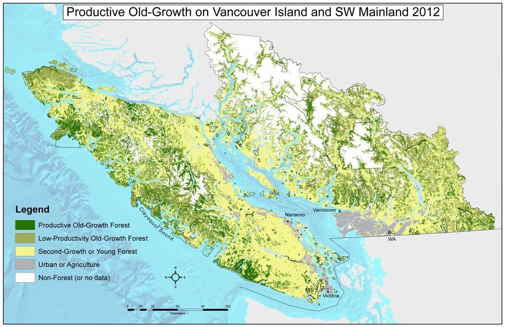 卫星照片显示,温哥华岛上大约 75% 的原始古老森林已被砍伐,其中包括 90% 的谷底,那里生长着最大的树木和多样性的生物。在巴克利湾以南的温哥华岛南部,大约 87% 的原始古老森林已被砍伐。