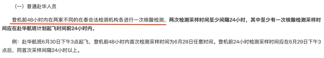 1、针对普通赴华人员,只需要在登机前48小时和24小时分别在两家不同的在泰合法检测机构各进行一次核酸检测,即可申请回国健康码。
