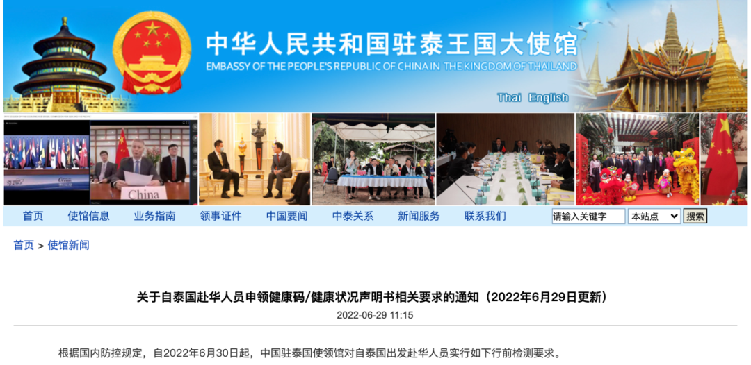 6月29日,中国驻泰国大使馆发布最新公告,对自泰国出发的赴华人员行前检测进行了简化。