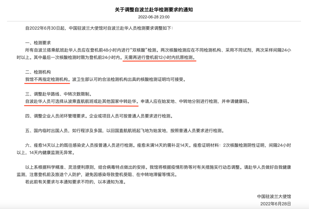 6月28日,中国驻波兰大使馆也发布通知,宣布: