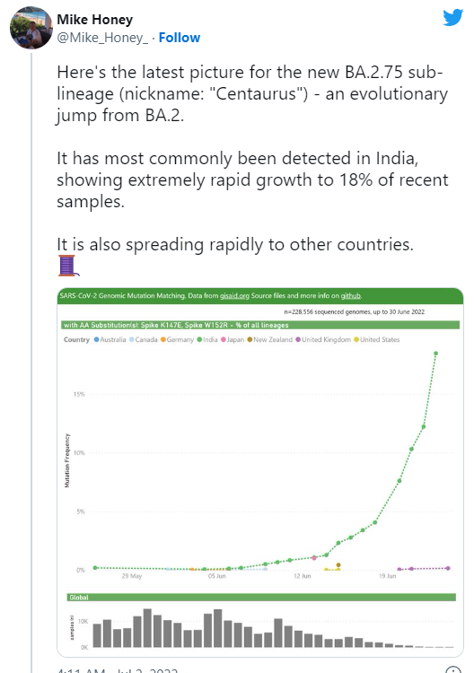 BA.2.75的传播速度比BA.2、BA.5变种似乎都要更快,加之此前感染新冠的人可能无法对其产生免疫屏障。不少科学家都忧心忡忡地表示,这可能是下一个全球新冠浪潮的开端。