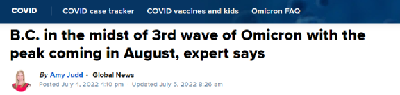 UBC大学进化生物学教授Sally Otto 博士表明,模型显示如今奥密克戎BA.5变体正在BC省各个社区肆虐传播,她预测BC省的病例数将在8月某个时候达到峰值。