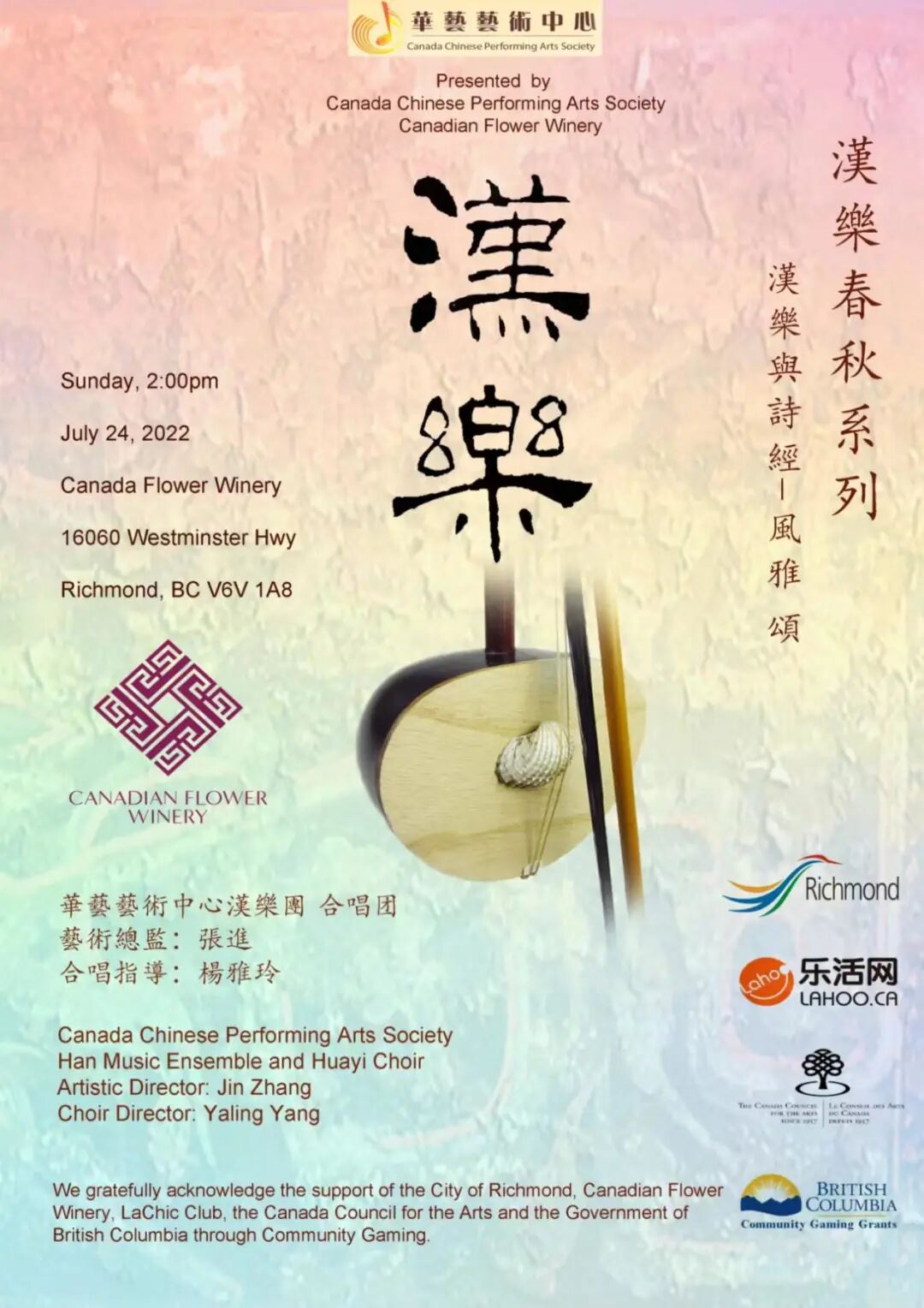 7月24日在Canadian Flower Winery的户外演出是一次向本地观众现场介绍汉乐的机会。演出活动得到了Richmond city,Canadian Flower Winery和乐活网的大力协助和支持。