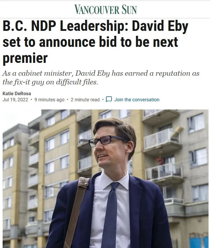 继两位内阁厅长表态无意角逐党领之后,律政兼住房厅长尹大卫(David Eby)成了各界瞩目的焦点。