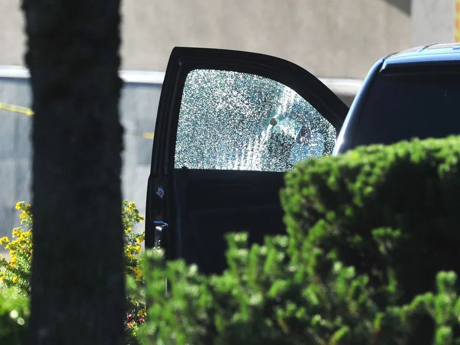 在 Willowbrook Mall 的停车场,看到一辆黑色警车上布满了至少九个弹孔。