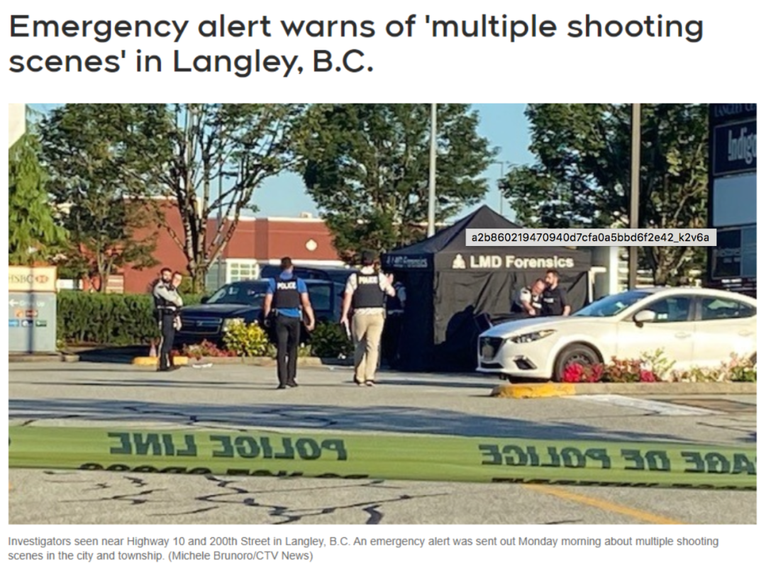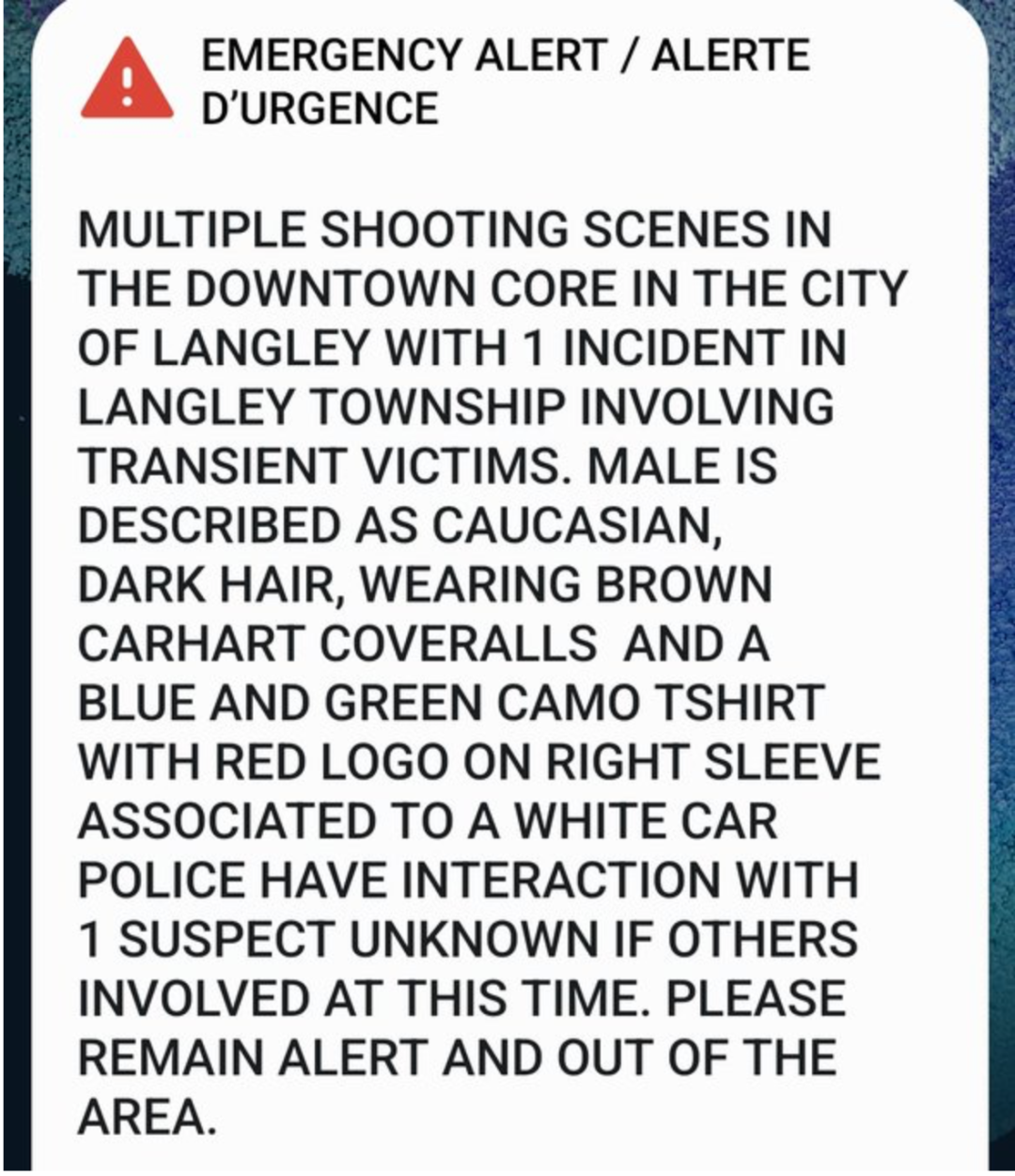 [加拿大乐活网lahoo.ca 郭星撰稿]7月25日(周一)早上,加拿大皇家骑警报告称,大温市兰利市发生多起枪击事件。BC大部分省民通过手机收到了该紧急警报。至少有一人死亡,综合凶杀案调查组 (IHIT) 正在进行调查。