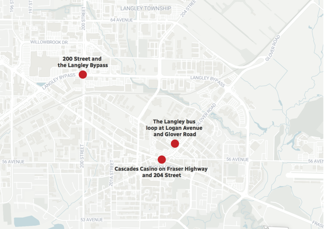 兰利市和兰利镇的多个地区对公众关闭。人们被要求远离 200 Street 和 Langley Bypass 附近的区域;位于 Fraser Highway 和 204 Street 的 Cascades Casino 停车场;以及 Logan Avenue 和 Glover Road 的 Langley bus loop。