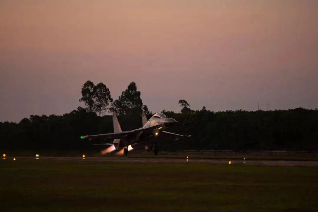 南部战区微信公众号8月2日报道,“八一”备战忙,夜幕降临,海南某机场战机列阵、引擎轰鸣,南部战区海军航空兵某旅一场多课目、多批次的跨昼夜飞行训练拉开帷幕。