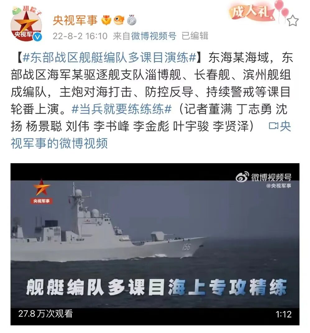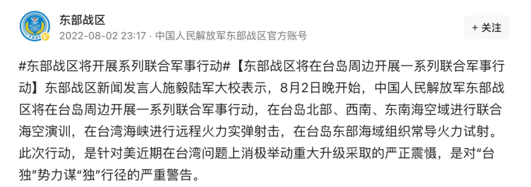 东部战区新闻发言人施毅陆军大校表示,8月2日晚开始,中国人民解放军东部战区将在台岛周边开展一系列联合军事行动,在台岛北部、西南、东南海空域进行联合海空演训,在台湾海峡进行远程火力实弹射击,在台岛东部海域组织常导火力试射。此次行动,是针对美近期在台湾问题上消极举动重大升级采取的严正震慑,是对“台独”势力谋“独”行径的严重警告。